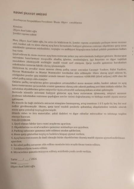 GDU rektorunun ailə üzvləri iş adamının restoranını məcburi satdırmaq istəyir - Şəmkirdə sahibkara qarşı təzyiqlər