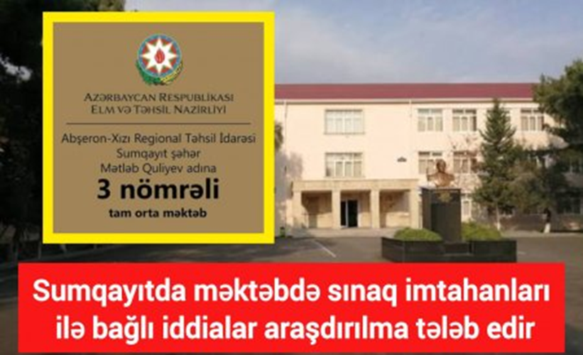 Sumqayıt şəhər 3 nömrəli tam orta məktəbdə Azəri kursuna aid sınaq imtahan biletlərinin istifadəsi ilə bağlı səsləndirilən iddialar ictimai müzakirələrə səbəb olub.