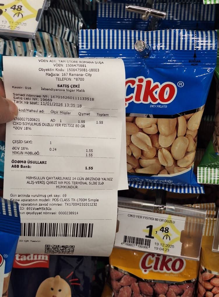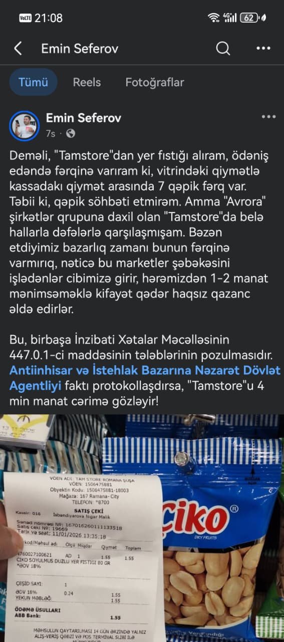 Şikayətçi Emin Səfərovun sözlərinə görə, marketdən yer fıstığı alarkən vitrində göstərilən qiymətlə kassada tətbiq olunan qiymət arasında 7 qəpik fərq olub. Vətəndaş qeyd edir ki, məsələ məbləğin azlığında deyil, bu cür halların müntəzəm təkrarlanmasındadır.
