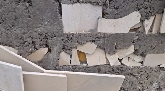 Fotolar və müşahidələr problemin texniki səbəblərini də açıq şəkildə ortaya qoyur. Məlum olur ki, üzlük materialları divara standartlara uyğun şəkildə bərkidilməyib. Belə ki, istifadə olunmalı olan sement və xüsusi yapışdırıcı qat əvəzinə, divar altına müxtəlif tikinti tullantıları - qırıq plitə parçaları yerləşdirilib. Bu isə həm dayanıqlılığı azaldıb, həm də üzlüklərin qısa müddətdə qopmasına səbəb olub.